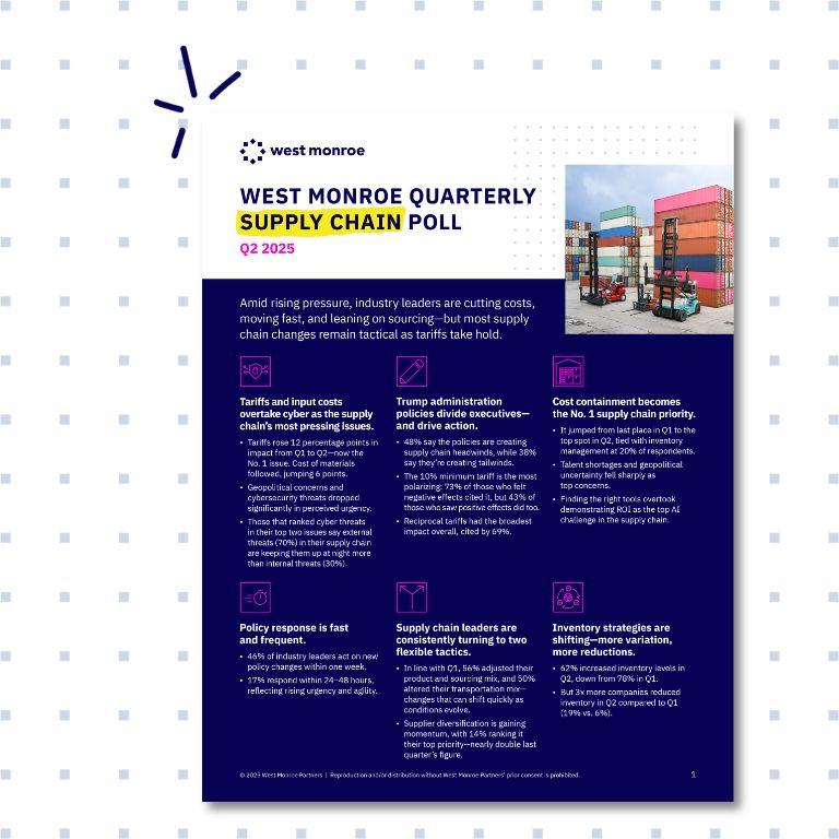 The Q2 results from West Monroe’s Quarterly Supply Chain Poll go deeper than what’s covered here. Download the full report to see which Trump administration policies executives say are helping—or hurting—their supply chains, how companies are applying AI across operations, and the specific cyber threats keeping supply chain leaders up at night.