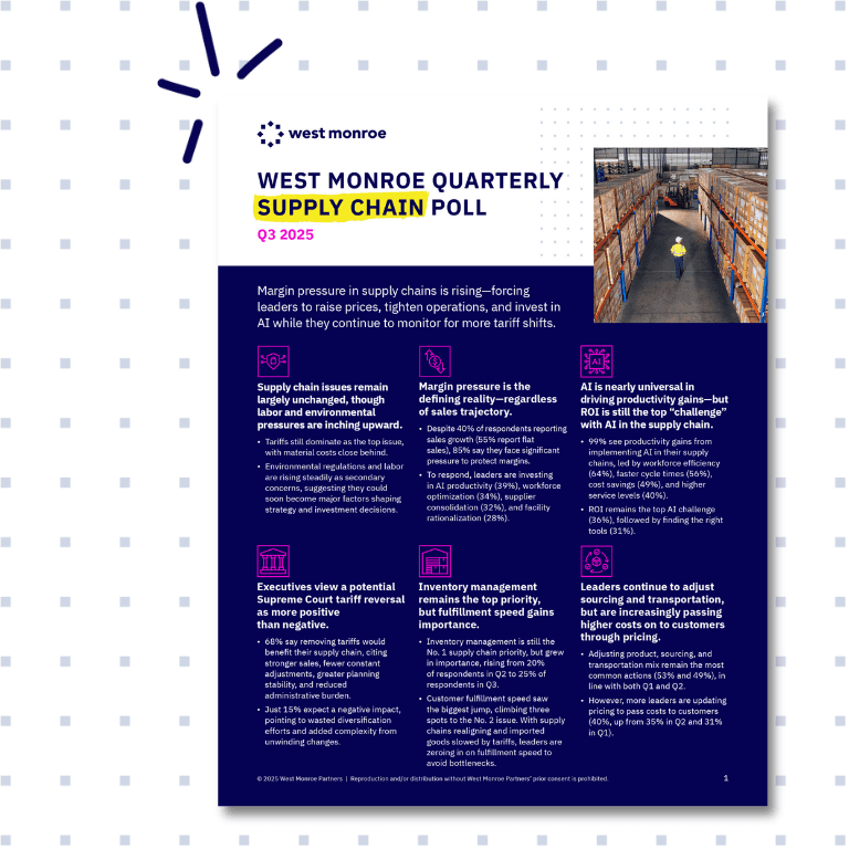 In Q3 of West Monroe’s Quarterly Supply Chain Poll, leaders found themselves squeezed from all sides: margin pressure is escalating, even as AI increases productivity, and the Supreme Court’s potential tariff ruling looms as a wild card. Companies continue to manage for today’s issues, without the visibility and certainty to plan for the long term.